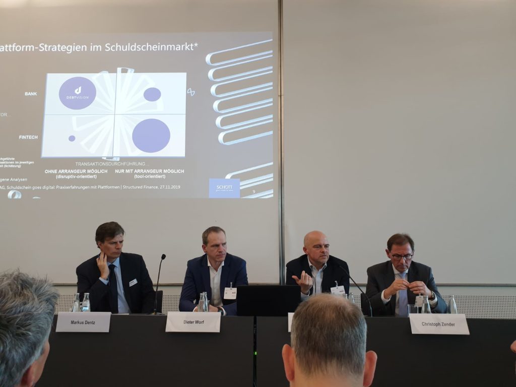 Am ersten Tag der Structured Finance fand außerdem unsere Praxissession „Schuldschein goes digital“ statt. Dieter Worf, Head of Treasury der Schott AG, Christoph Zender, Head of Corporate Finance Origination LBBW, und unser Geschäftsführer Christoph Steinbrich diskutierten mit den zahlreichen Teilnehmern der Session über die Entwicklung und die Einsatzmöglichkeiten von Plattformen im Schuldscheinmarkt. Dieter Worf konnte dabei von seinen Erfahrungen aus zwei Schuldscheintransaktionen, die die SCHOTT AG im Jahr 2019 exklusiv und ohne arrangierende Bank über DEBTVISION begeben hat, berichten. Moderiert wurde die Praxissession von Markus Dentz – vielen Dank dafür! Wir freuen uns schon auf’s nächste Mal!